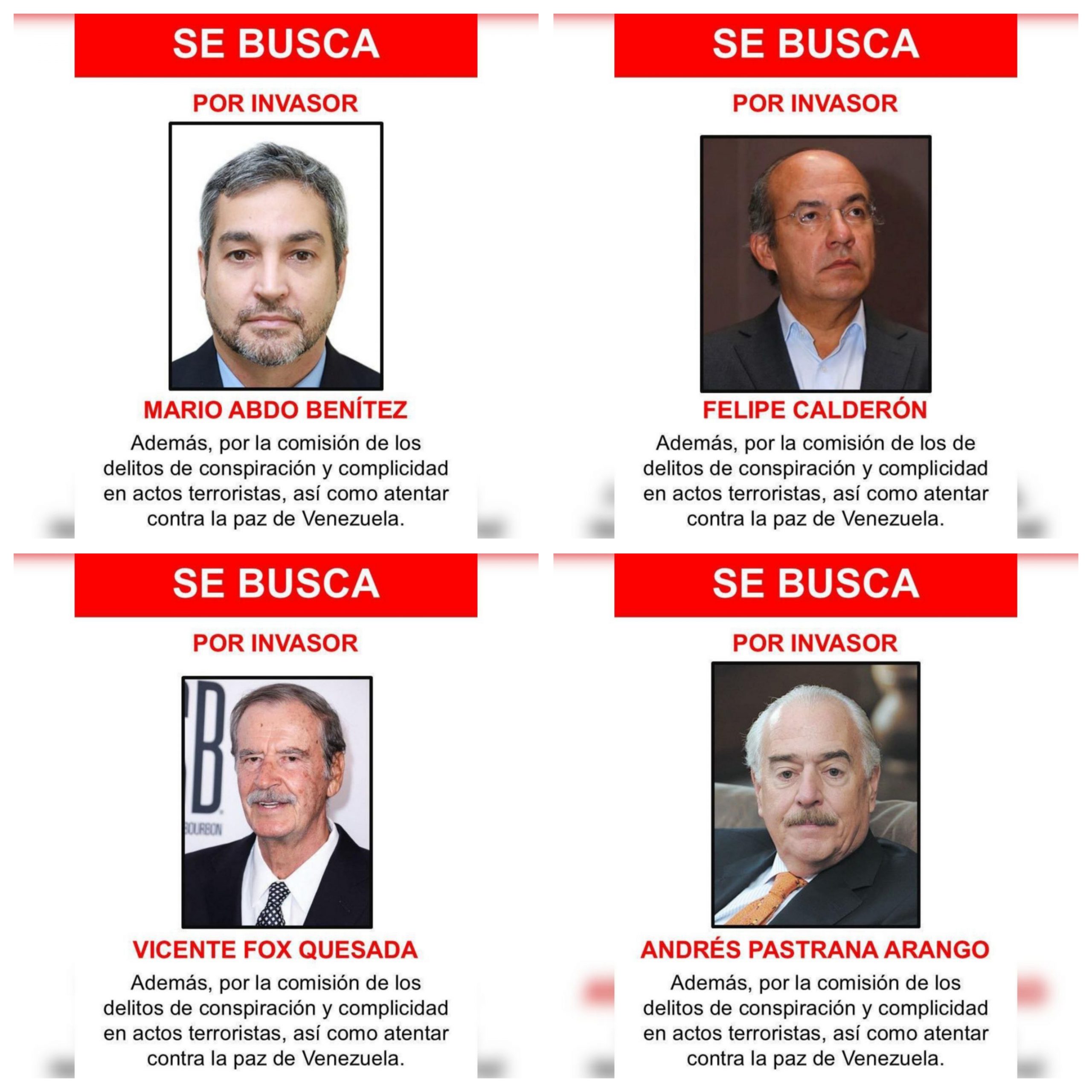 Mario Abdo Benítez (Paraguay), Jorge Jamil Mahuad Witt (Ecuador), Felipe Calderón (México), Mireya Moscoso (Panamá), Vicente Fox Quesada (México), Ernesto Pérez-Balladares (Panamá) y Andrés Pastrana Arango (Colombia), aparecen en carteles de «se busca» emitidos de forma digital por el cuerpo de investigación venezolano.
