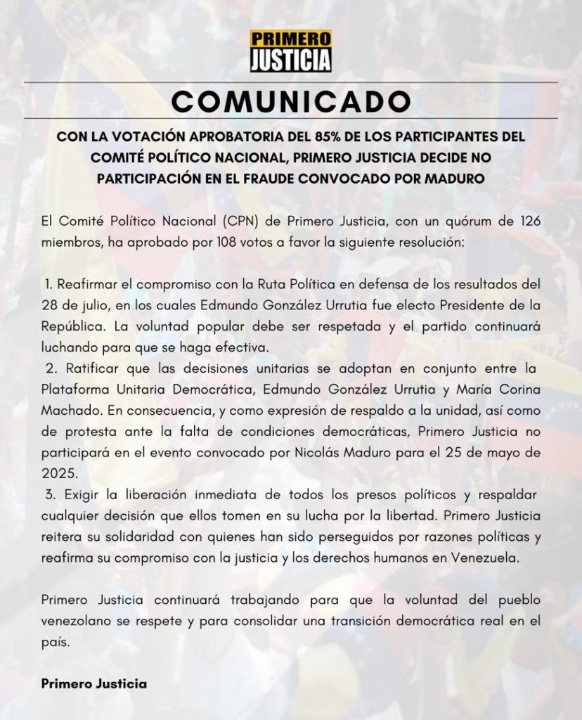 Con 85% de votos aprobatorios, el Comité Político Nacional del partido Primero Justicia resolvió no participar en las elecciones legislativas y regionales convocadas para el 25 de mayo.