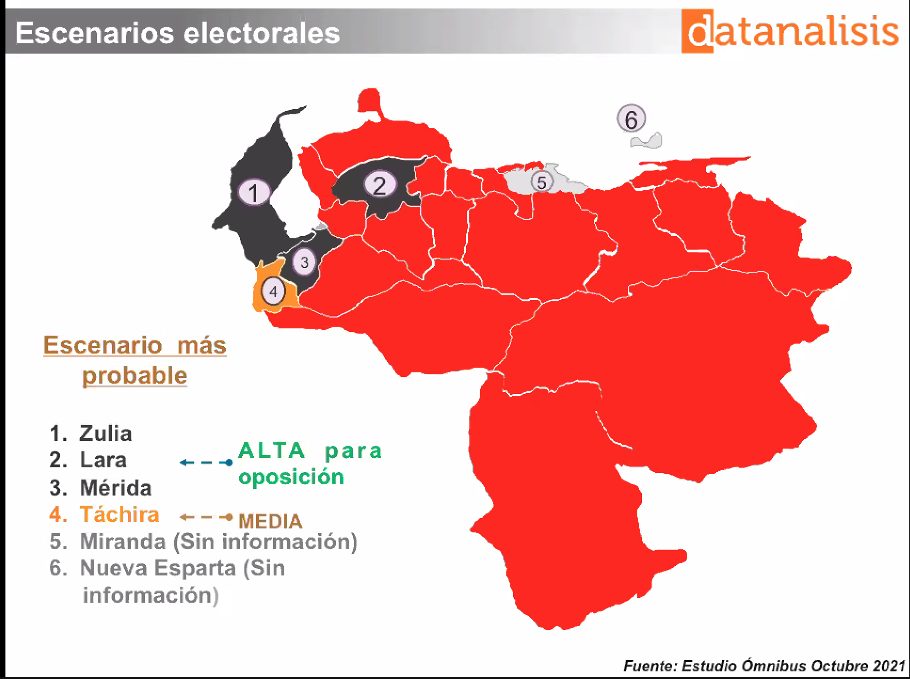 Con todos estos elementos, Luis Vicente León, señala que las posibilidades de triunfo opositor parecen claras en Zulia, Lara y Mérida.