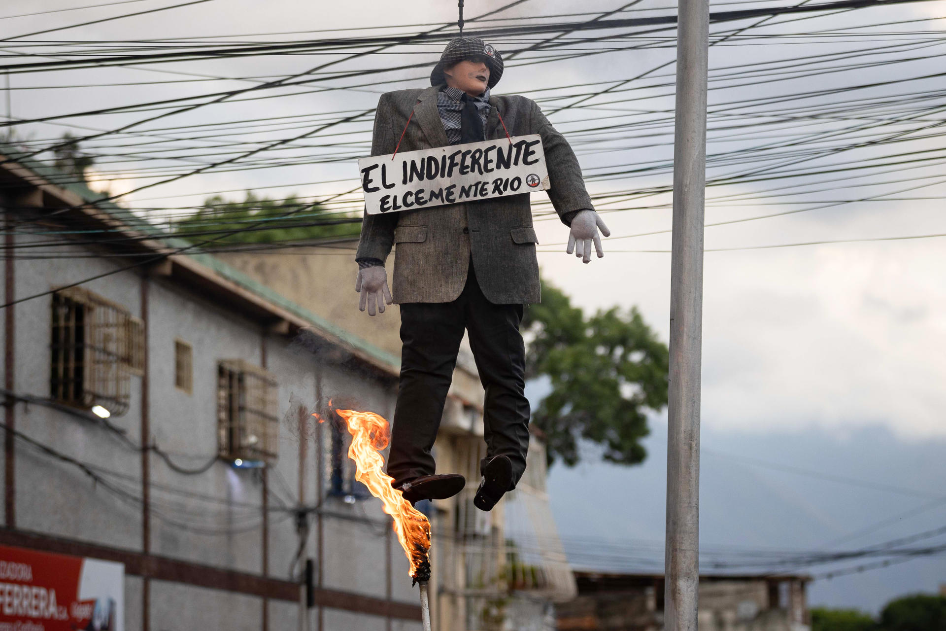 A las afueras de El Helicoide, sede del Servicio Bolivariano de Inteligencia (Sebin) en Caracas, los familiares de los presos políticos también quemaron a un Judas que representa a estos detenidos cuando son sacados de la cárcel, con una capucha en la cabeza.