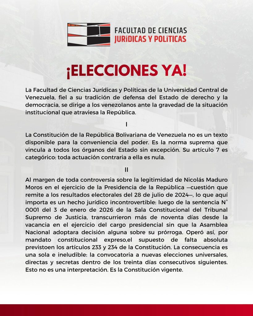 La Facultad de Ciencias Jurídicas y Políticas de la Universidad Central de Venezuela (UCV) emitió un pronunciamiento oficial, bajo el lema «¡ELECCIONES YA!», en el que demanda el cumplimiento del hilo constitucional y la convocatoria a nuevos comicios presidenciales ante lo que califica como una grave situación institucional en el país.