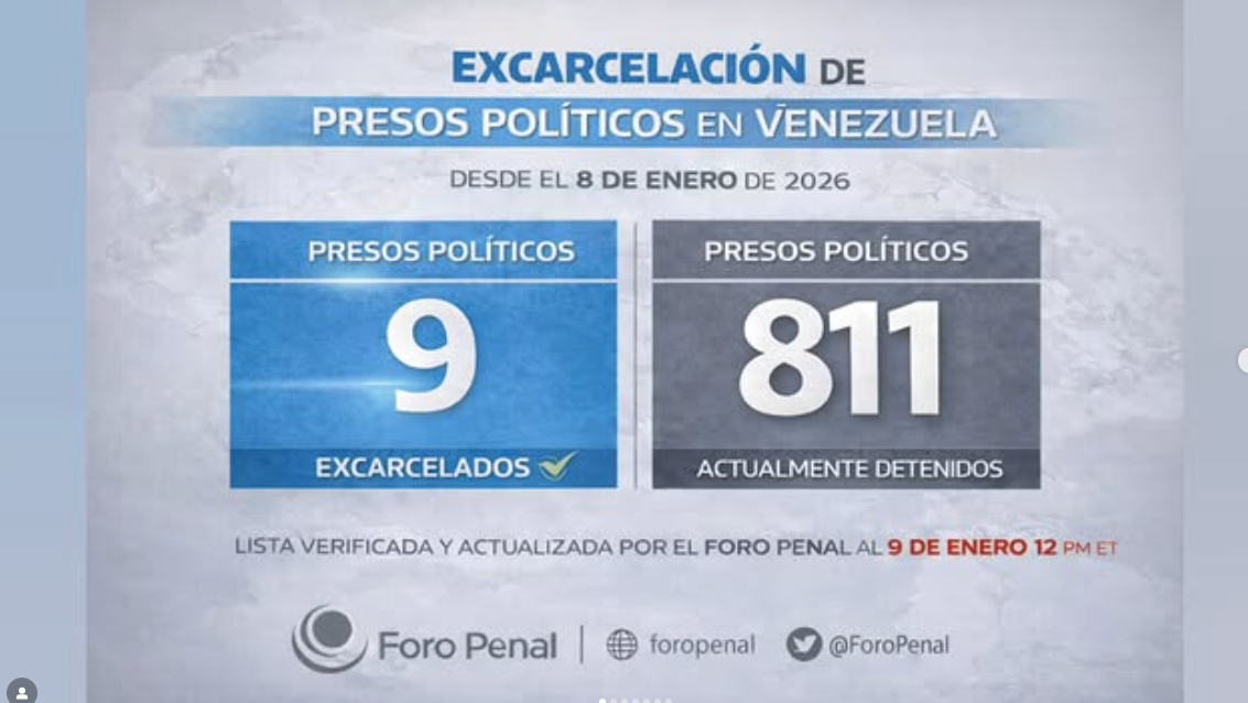 En sus redes sociales la Organización No gubernamental Foro Penal señaló que de hasta las 3:00pm de este 8 de enero ha confirmado la excarcelación de nueve presos políticos, en el marco del anuncio hecho por el presidente de la Asamblea Nacional, Jorge Rodríguez.