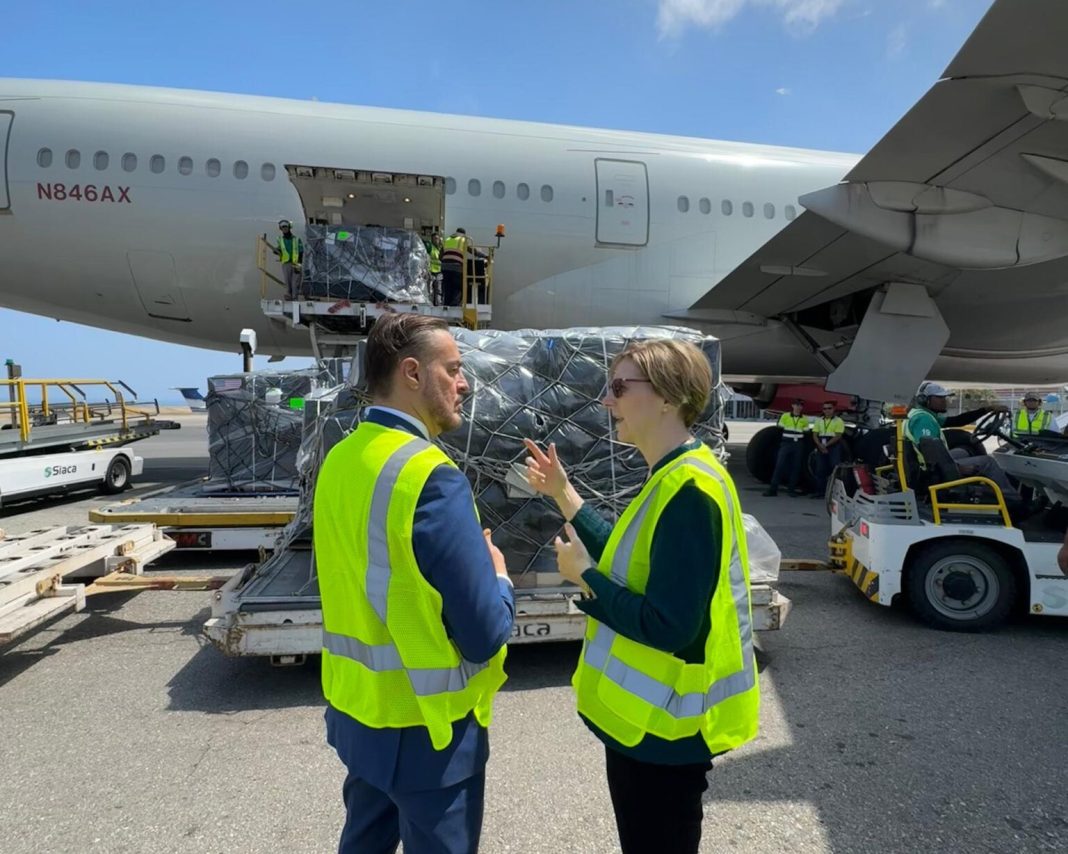 «¡Otro día productivo aquí en Caracas! Hoy facilitamos la entrega de más de 6.000 kilos de medicamentos para apoyar la recuperación del pueblo venezolano» expresó la Embajada a través de X y Instagram. En la imagen compartida, se observa al personal diplomático supervisando la descarga de los cargamentos de gran tamaño desde una aeronave de carga.