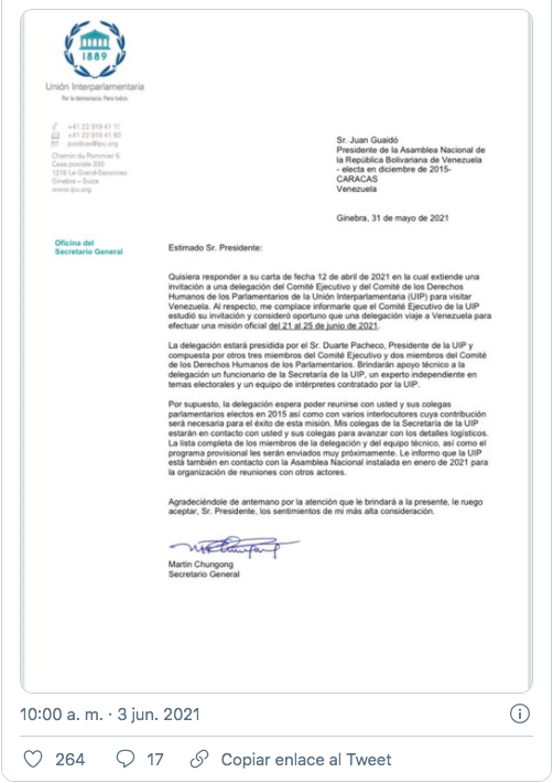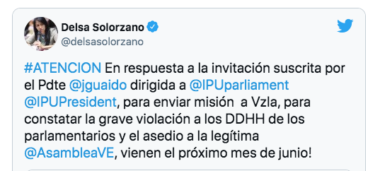La dirigente de la oposición, Delsa Solórzano difundió a través de su cuenta de Twitter, la carta enviada a Guaidó por el secretario general de la UIP, Martín Chungong, en la cual le informan que “el Comité Ejecutivo de la UIP estudió su invitación y consideró oportuno que una delegación viaje a Venezuela para efectuar una misión oficial”.
