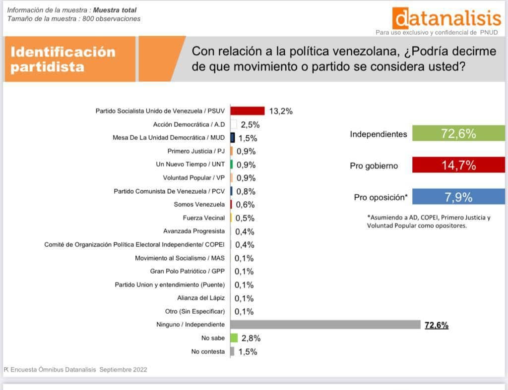 Sin movimientos. Sin partidos. La mayoría de los venezolanos se declaran independientes, según el más reciente estudio de Datanalisis difundido por redes sociales. Los progobierno (14,7%) y los favorables a la oposición (7,9%) apenas superan 20%; en cambio, 72,6% (siete de cada 10) se identifica como independiente.