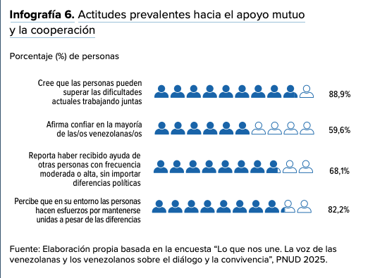 El informe indica que “en la vida cotidiana, persisten prácticas de cooperación y apoyo mutuo. El 88,9% cree que las personas pueden superar las dificultades actuales trabajando juntas, mientras que el 59,6% afirma confiar en la mayoría de las venezolanas y los venezolanos”.
