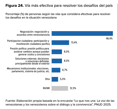 Al preguntar a las personas encuestadas cuál vía consideran más efectiva para resolver los desafíos en la situación venezolana, “negociación y acuerdos entre venezolanos” obtuvo el 46,4 %», y “movilización social” registró 13,4 %, superando otras alternativas.