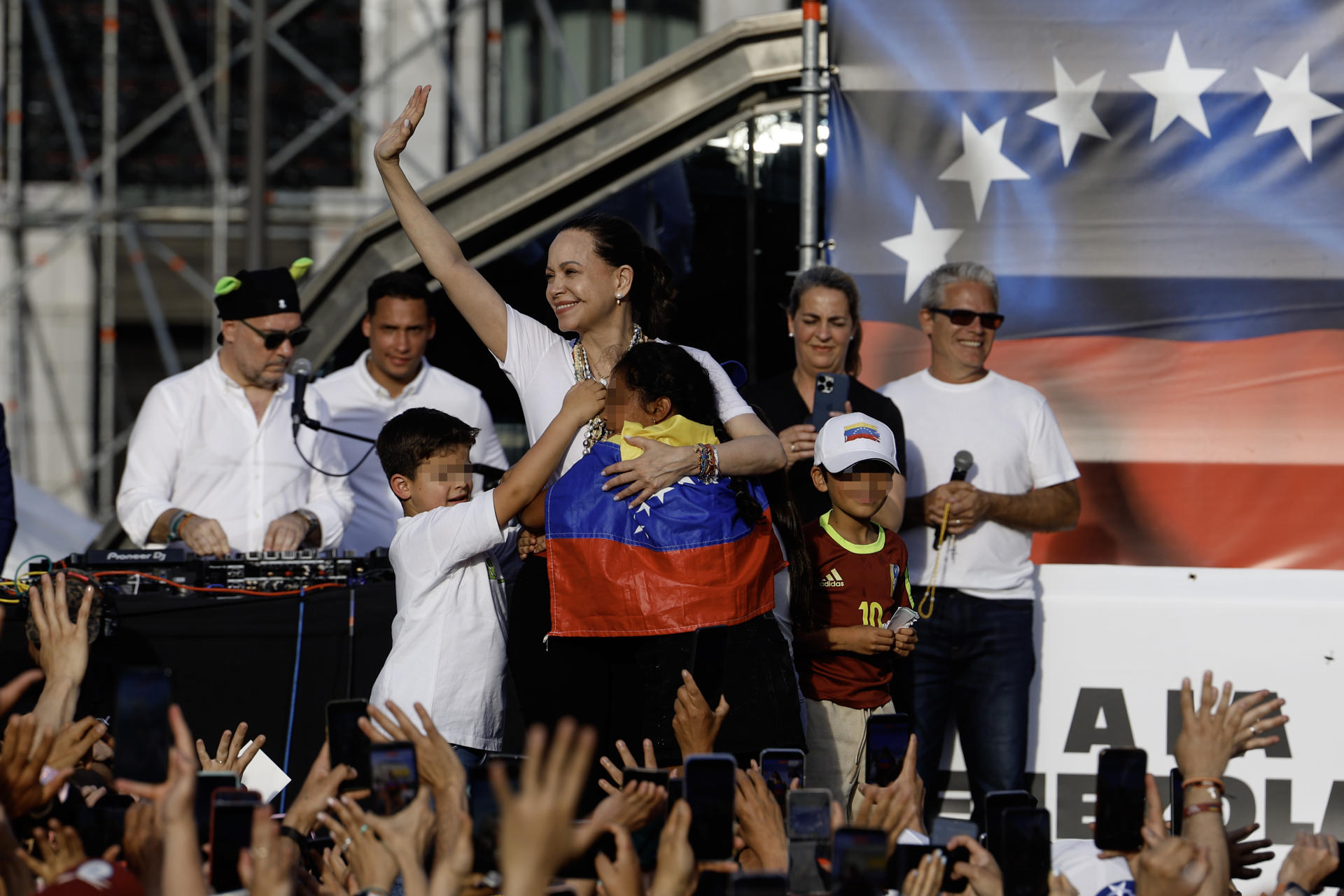 Ondeando banderas de Venezuela y mostrando pancartas con lemas como «María Corina, esperanza y libertad», «Libertad para los presos políticos» o «Volver a casa a la venezolana», los concentrados ovacionaron con pasión a su líder cuando apareció.