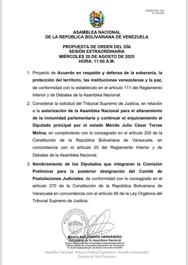 El orden del día del órgano legislativo también señaló que se discutirá un acuerdo en respaldo a la «defensa de la soberanía, la protección del territorio, las instituciones venezolanas y la paz».