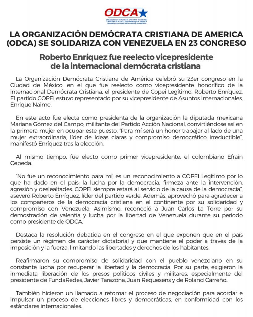 La Organización Demócrata Cristiana de América se solidariza con Venezuela, en su congreso número 23 eligen a sus autoridades