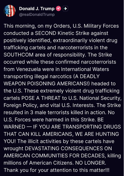 «Esta mañana, bajo mis órdenes, las Fuerzas Armadas de los Estados Unidos llevaron a cabo un SEGUNDO ataque cinético contra cárteles de narcotraficantes y narcoterroristas extraordinariamente violentos e identificados con certeza en la zona de responsabilidad del Comando Sur (SOUTHCOM)», indica el post del presidente estadounidense es su plataforma Truth Social.