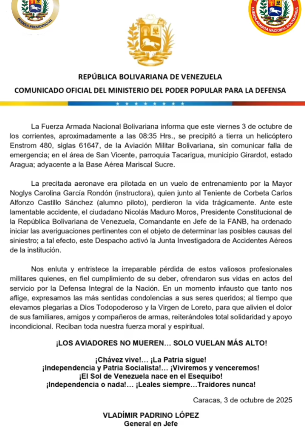 El ministerio de Defensa venezolano emitió un comunicado para lamentar el accidente del helicóptero ocurrido en el área de San Vicente, parroquia Tacarigua, municipio Girardot del estado Aragua, el cual resultó con la muerte de dos funcionarios de la Fuerza Armada Nacional Bolivariana (FANB).