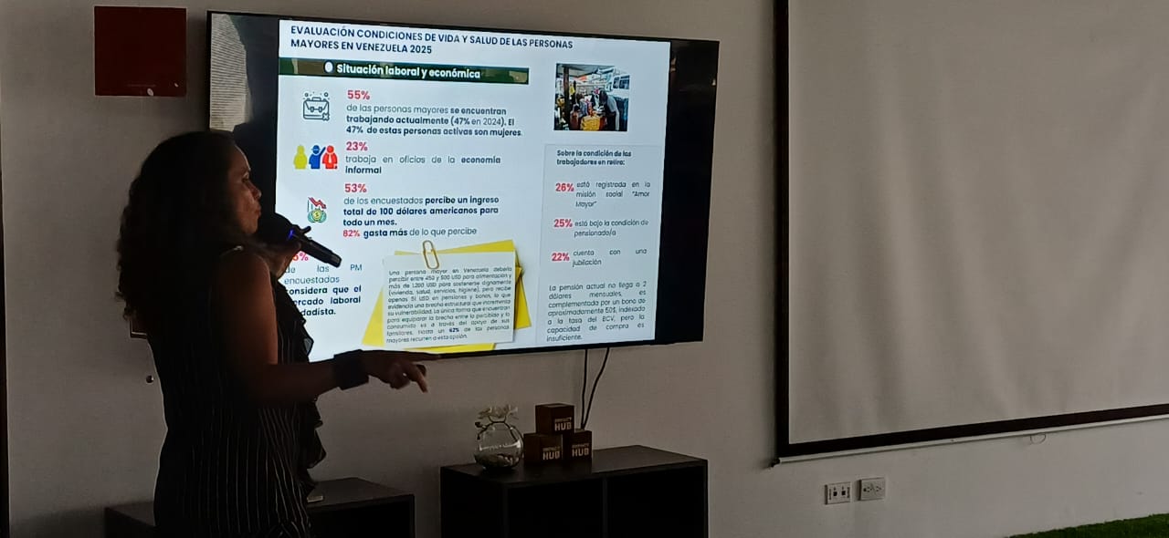 Según el sondeo efectuado en 2025, 55 % de la población adulta mayor encuestada está trabajando, 23 % lo hace en la economía informal y 53 % percibe un ingreso de 100 dólares o un poco más y se ayudan con los bonos, indicó la investigadora en el evento «Desafíos y oportunidades del envejecimiento poblacional en Venezuela: una mirada desde la asistencia humanitaria y las agendas de desarrollo», realizado este jueves en Impact Hub, en Caracas.