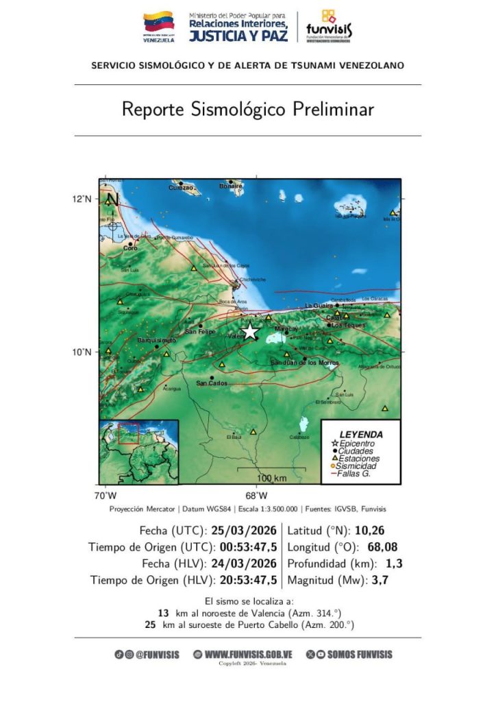La Fundación Venezolana de Investigaciones Sismológicas (Funvisis) reportó un temblor de magnitud 3.7 la noche de este martes en Valencia.