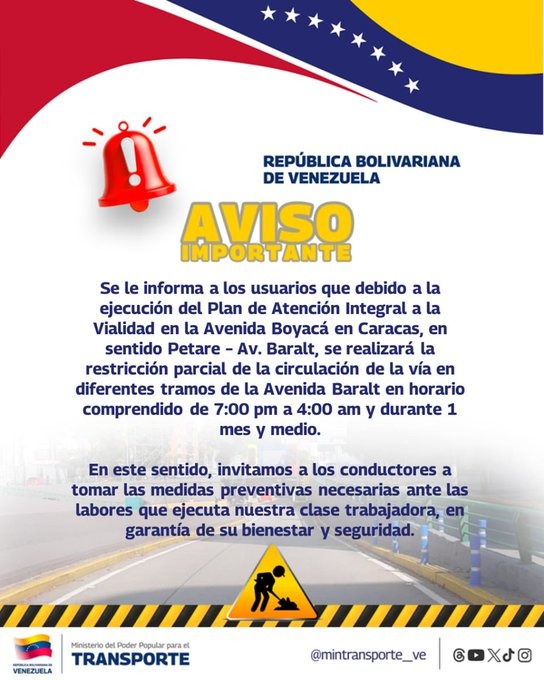 De acuerdo a lo informado, la avenida tendrá restricción restringida desde las 7:00 P.M. a 4:00 A. M y se debe a la ejecución del “Plan de Atención Integral a la vialidad en la avenida Boyacá, sentido Petare-Av. Baralt”.