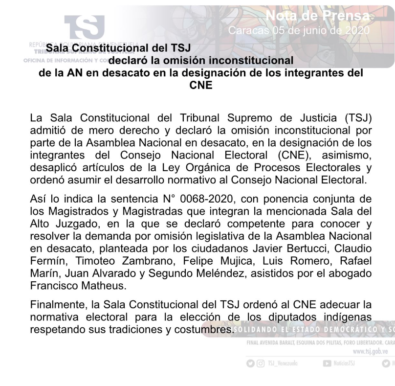 En una nota, el tribunal indicó en la sentencia N° 0068-2020, con ponencia conjunta de los Magistrados y Magistradas que integran la mencionada Sala del Alto Juzgado, en la que se declaró competente para conocer y resolver la demanda por omisión legislativa de la Asamblea Nacional en desacato, planteada por los ciudadanos Javier Bertucci, Claudio Fermín, Timoteo Zambrano, Felipe Mujica, Luis Romero, Rafael Marín, Juan Alvarado y Segundo Meléndez, asistidos por el abogado Francisco Matheus.