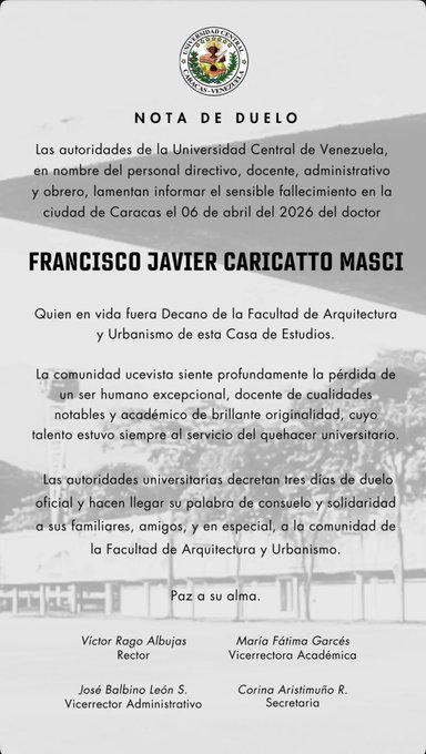 El decano de la Facultad de Arquitectura de la Universidad Central de Venezuela (UCV), Javier Caricatto, falleció este lunes 6 de abril en un accidente de tránsito.