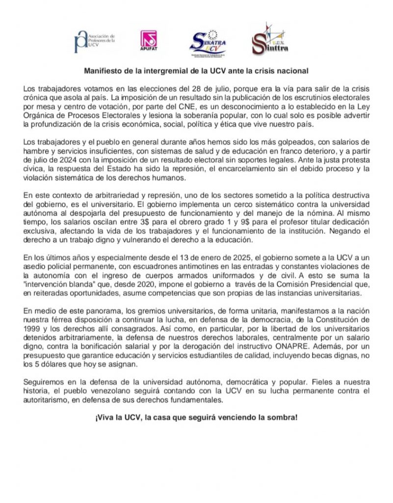 Denunciaron, también, que desde el 13 de enero de este año el gobierno somete a la UCV «a un asedio policial permanente, con escuadrones antimotines en las entradas y constantes violaciones de la autonomía con el ingreso de cuerpos armados uniformados y de civil». A esto se suma, añadieron, «la intervención blanda que desde 2020 impone el gobierno a través de la Comisión Presidencial».