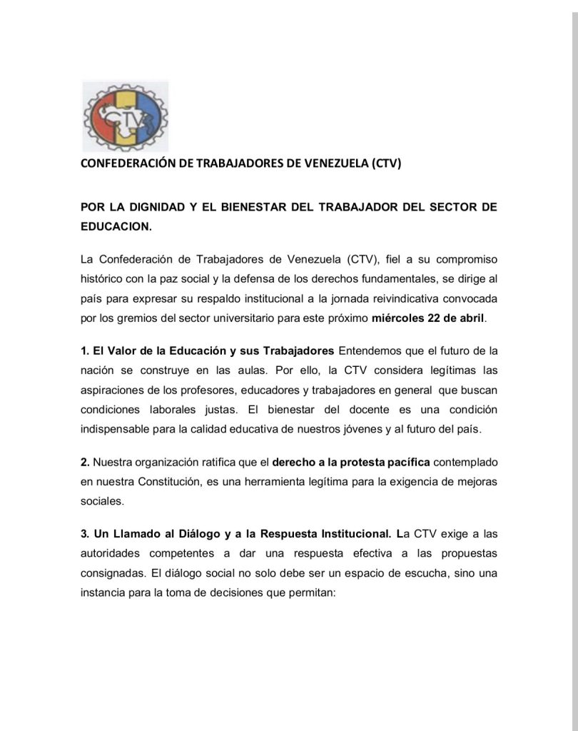 La Confederación de Trabajadores de Venezuela (CTV) dio su respaldo institucional a la jornada de protesta convocada por los gremios universitarios para este miércoles 22 de abril.