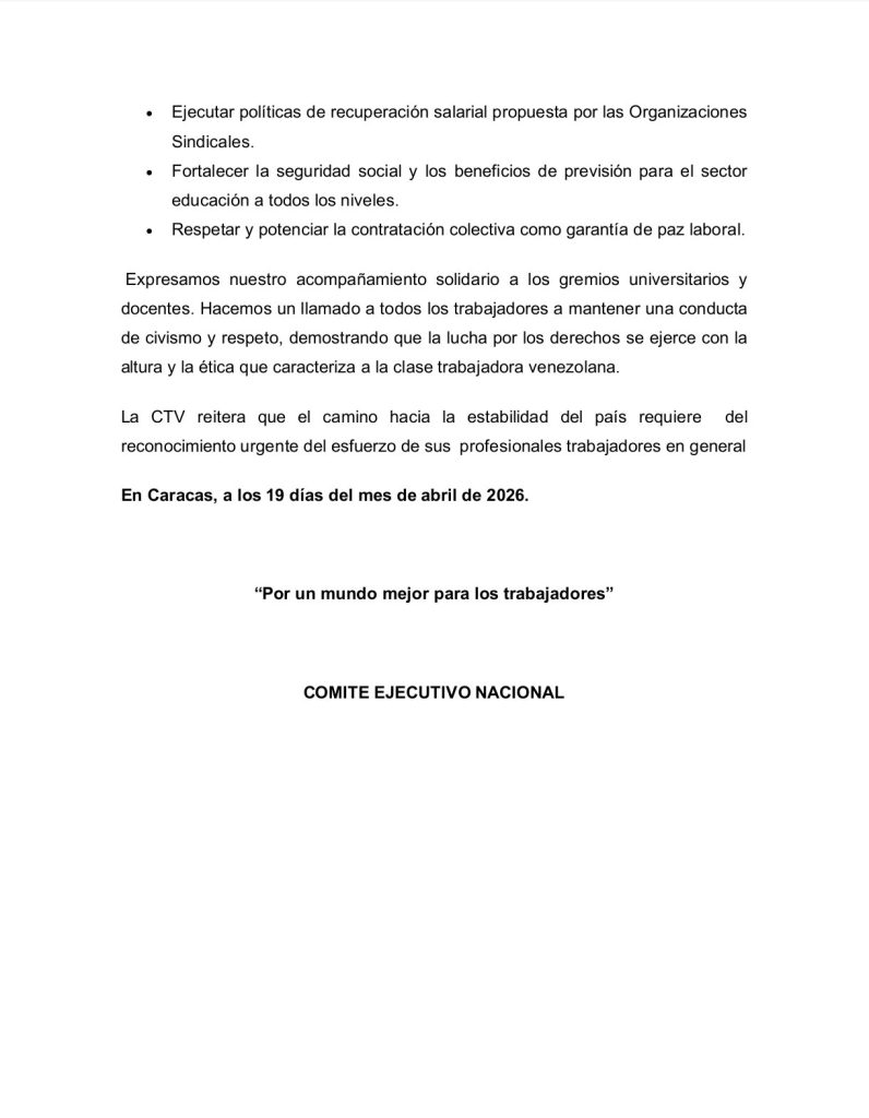 «La CTV considera legítimas las aspiraciones de los profesores, educadores y trabajadores en general que buscan condiciones laborales justas», subrayó la organización en un comunicado. «El derecho a la protesta pacífica contemplado en nuestra Constitución es una herramienta legítima para la exigencia de mejoras sociales».