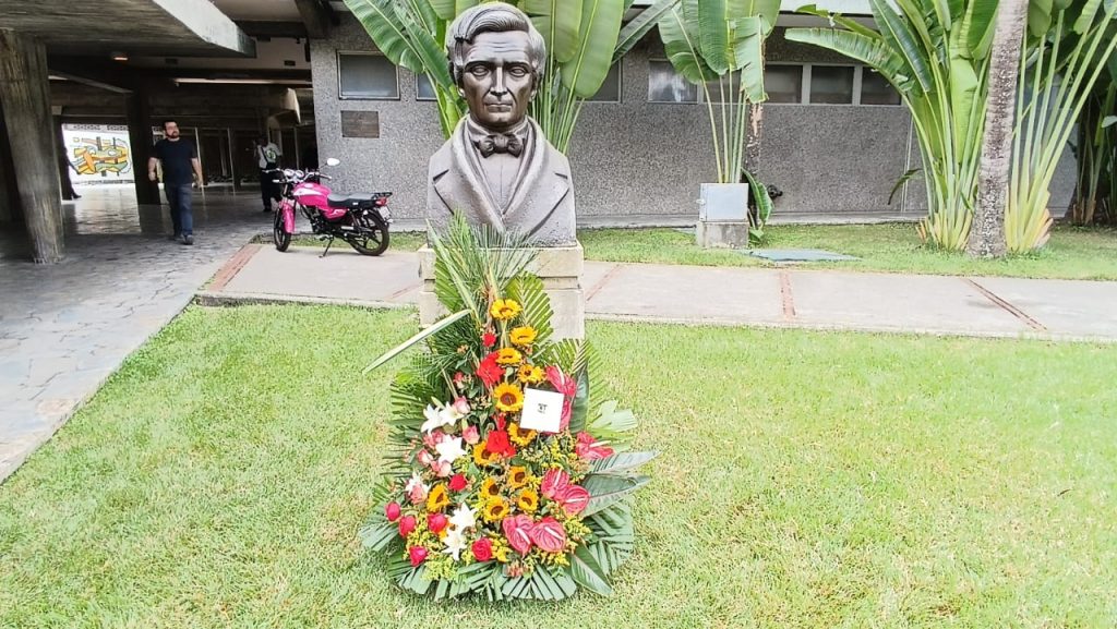 Antes de realizar el acto en el Auditorio Naranja de Faces, los profesores hicieron una ofrenda floral al busto de José María Vargas que se encuentra en la Plaza del Rectorado de esa casa de estudio.