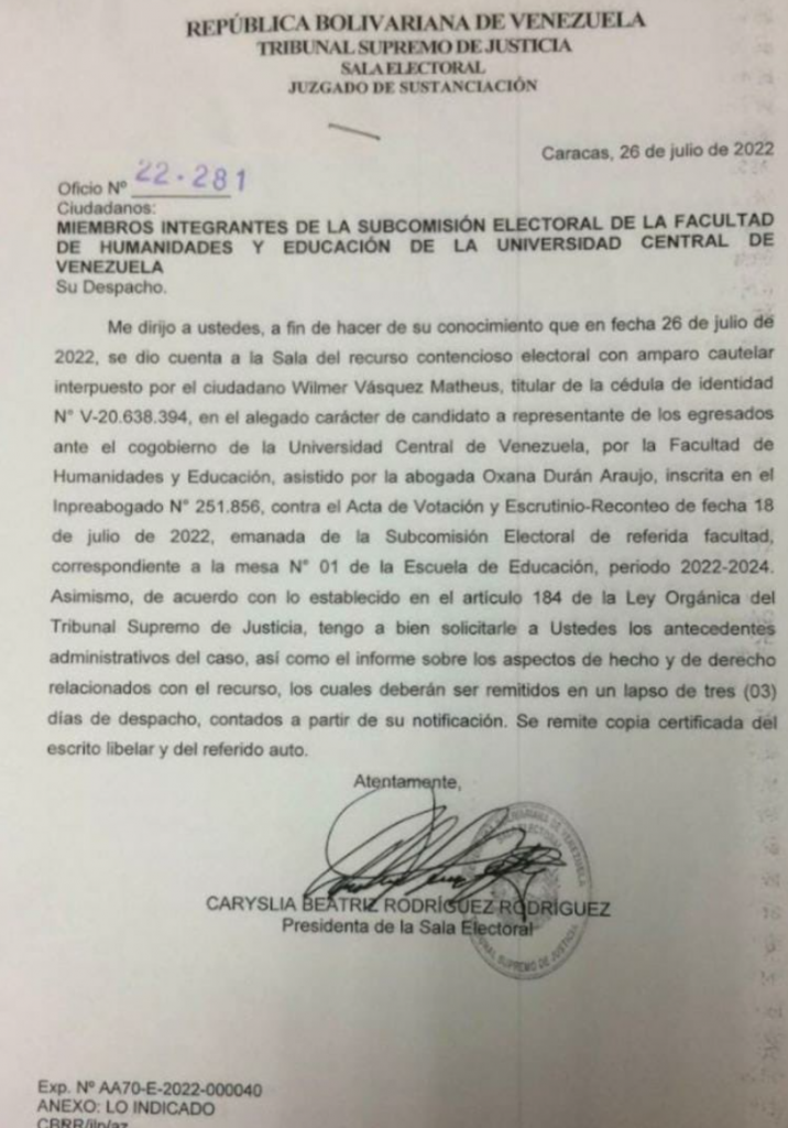 La Sala Electoral del Tribunal Supremo de Justicia (TSJ) notificó a la Comisión Electoral de la Universidad Central de Venezuela (UCV), que admitió un recurso de amparo que impugna los resultados de las elecciones de egresados realizadas en la Facultad de Humanidades y Educación de esa casa de estudios.