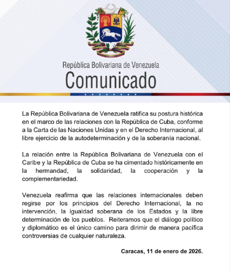 A través de un comunicado oficial difundido por el canciller de la República, Yván Gil, el Ejecutivo venezolano reiteró que las relaciones entre los Estados deben regirse por los principios fundamentales del Derecho Internacional, en concordancia con la Carta de las Naciones Unidas. En el documento se enfatiza la importancia de la no intervención, la igualdad soberana de los Estados y el respeto a la libre determinación de los pueblos.