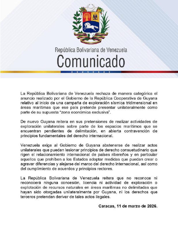 «De nuevo Guyana reitera en sus pretensiones de realizar actividades de exploración unilaterales sobre parte de los espacios marítimos que se encuentran pendientes de delimitación», reza un comunicado publicado en Telegram por el canciller, Yvan Gil. .
