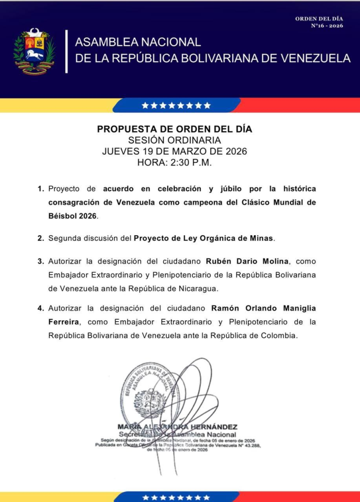 El primer punto del día es el Proyecto de acuerdo en celebración y júbilo por la histórica consagración de Venezuela como campeona del Clásico Mundial de Béisbol 2026.