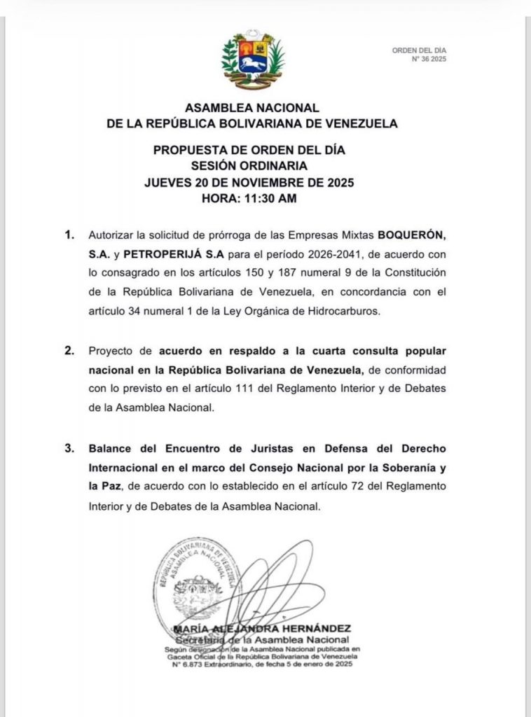 El pleno de la Asamblea Nacional (AN) ha convocado a su sesión ordinaria, este jueves a partir de las 11:30 de la mañana, al debate para autorizar la solicitud de prórroga de las empresas mixtas y proyecto de acuerdo en respaldo a la cuarta Consulta Popular.