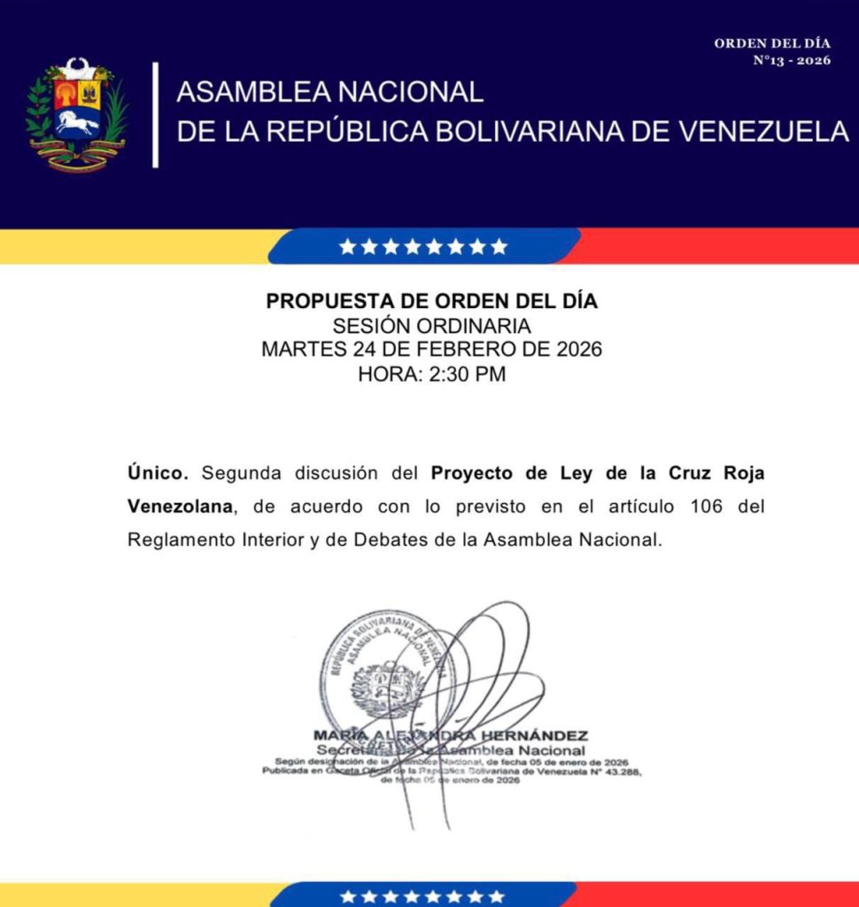 La Asamblea Nacional debatirá este martes 24 de febrero de 2026, a las 2:30 de la tarde, la segunda discusión del Proyecto de Ley de la Cruz Roja Venezolana.