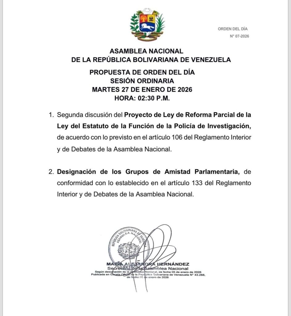 La Asamblea Nacional (AN) llevará a cabo su sesión ordinaria este martes a partir de las 2:30 p.m. El encuentro tiene como propósito abordar una agenda estratégica centrada en dos ejes fundamentales para el fortalecimiento del marco legal e institucional del país.