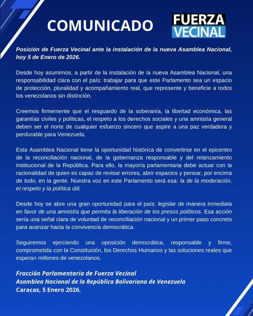 El partido Fuerza Vecinal expresó que asume su participación -desde este 5 de enero- en la Asamblea Nacional (AN) con responsabilidad ante el país para que el parlamento se convierta en un espacio de pluralidad y que beneficie a todos.