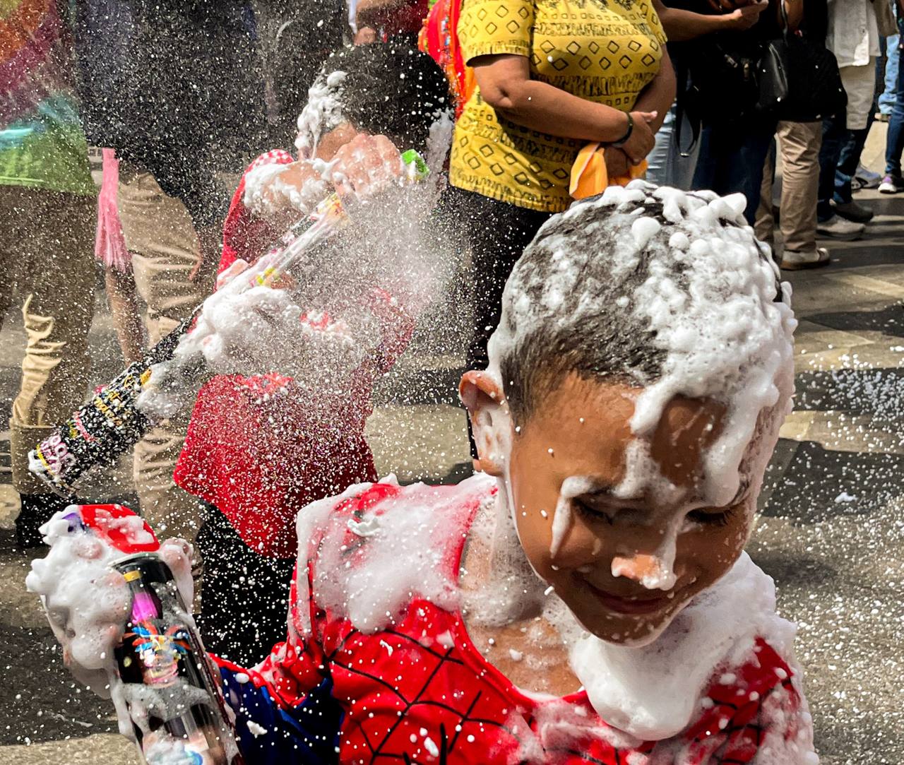 Entre toneladas descomunales de espuma y papelillos, los niños salieron a la calle con sus mejores disfraces, entre los cuales sobresalían numerosos spidermans, batmans y una antología de princesas de Disney. Incluso hubo un concurso de disfraces, en el que salieron premiados un Drácula (el cual llevó una barra completa para aplaudirlo), un transformer, un ingenioso avestruz, una chilindrina y una doña Florinda (que venían en pareja) y una geisha que no se enteró que había ganado pues se quedó dormida en los brazos de su madre.