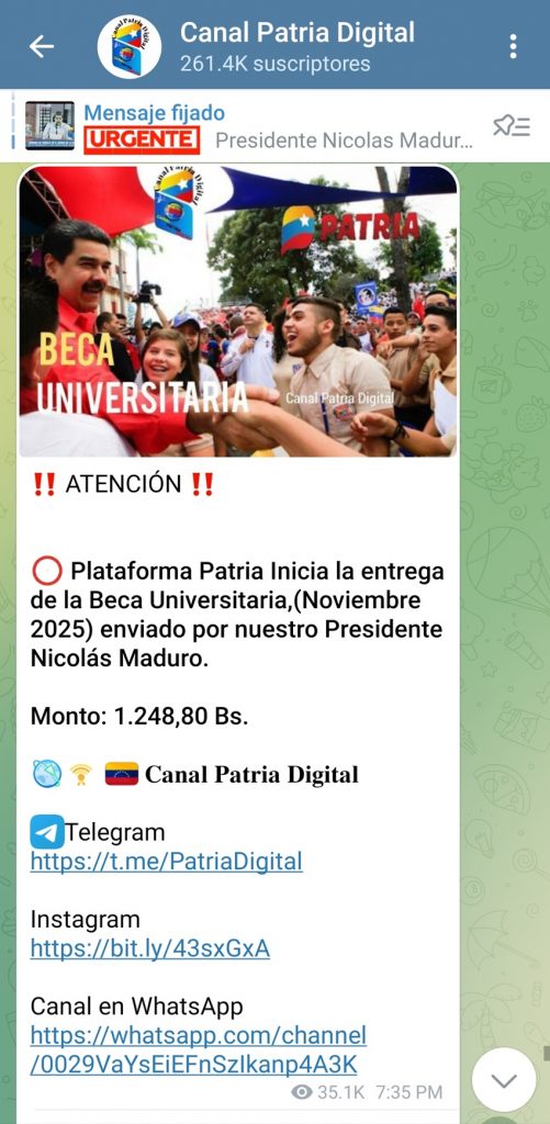 «Monedero Patria: Crédito por Bs. 1.248,80 por concepto Beca Universitaria (noviembre de 2025)», resaltó el mensaje que les llegó a los beneficiarios.