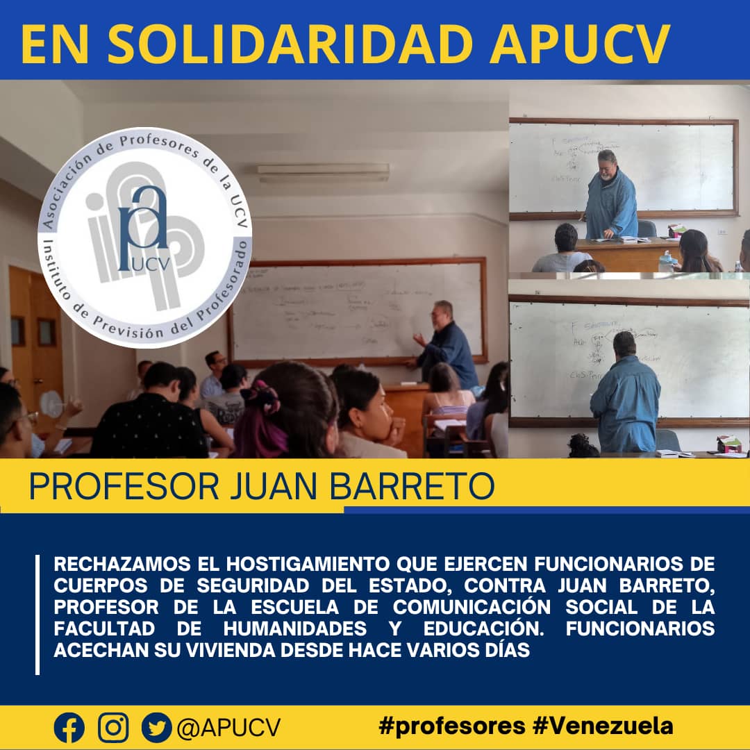 La APUCV indica que rechazan «el hostigamiento que ejercen funcionarios de cuerpos de seguridad del Estado contra juan Barreto, profesor de la Escuela de Comunicación Social de la Facultad de Humanidades y Educación. Funcionarios acechan su vivienda desde hace varios días».
