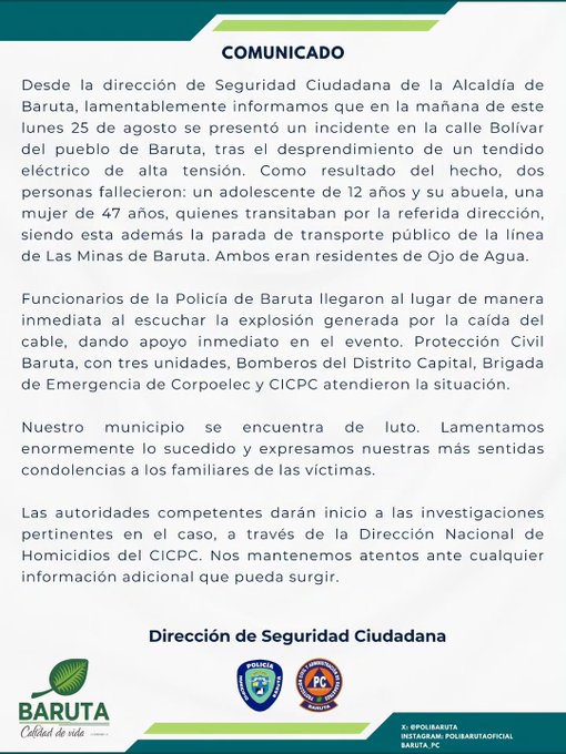 En horas de la mañana de este lunes 25 de agosto se registró un lamentable hecho en la calle Bolívar del pueblo de Baruta, estado Miranda. El desprendimiento de un tendido eléctrico dejó dos fallecidos, una señora de 47 años y un menor de edad de 12.