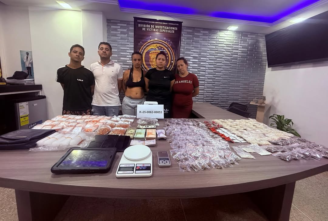 El CICPC detuvo a cinco presuntos traficantes de drogas en la avenida Baralt, sector Catuche, parroquia Altagracia del municipio Libertador, Distrito Capital. Los aprehendidos son Yenny Yakeline Peña (48), Manuel Alejandro D’León Palacio (25), Yajaira Josefina Palacio Zerpa (49), Omar Jhonnier D’León Palacio (26) y Rossel Cabriles Ruiz Nohemi (25).