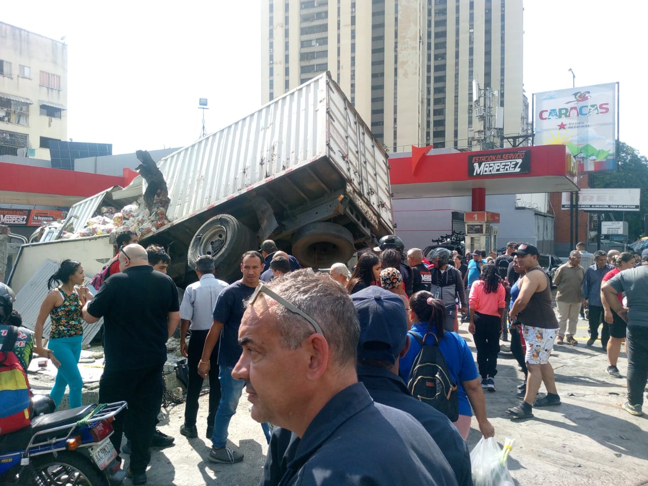 El periodista Román Camacho, quien se encuentra en el sitio de los hechos, que «involucra a un camión de carga, que sufrió presuntamente un desperfecto mecánico en el sistema de frenos y se llevó por el medio a unos motorizados que se encontraban surtiendo gasolina en la estación de servicio Maripérez».